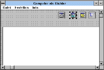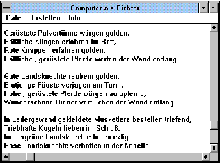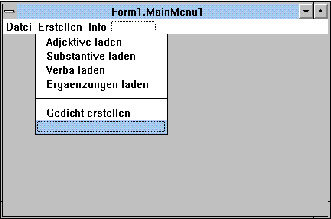 Ein Programm soll erstellt werden, mit dem verschiedene Textdateien editiert und gespeichert werden können. Aus je einer Textdatei mit Adjektiva, Substantive, Verba und Ergänzungen sollen mit Hilfe von Zufallszahlen einfache Sätze in "Gedichtform" gebildet und ausgegeben werden. Diese Gedichte sollen als Textdatei gespeichert und allenfalls ausgedruckt werden können. Der Programmablauf soll ausschließlich über Menü-Befehle anstelle von Buttons gesteuert werden.