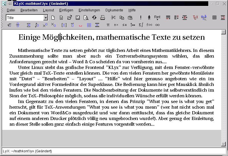 LaTeX - grafische Frontends verwendenTeX verarbeitet (lange) Texte und ergibt professionell gesetzte Seiten. Unter dem (ässerst stabilen) Betriebssystem Linux steht TeX, LaTeX und klyx gratis zur Verfügung. Damit wird der Einsatz von TeX bzw. LaTeX bedeutend vereinfacht, da zahlreiche Arbeiten per "Menü&MausKlick" erledigt werden können: