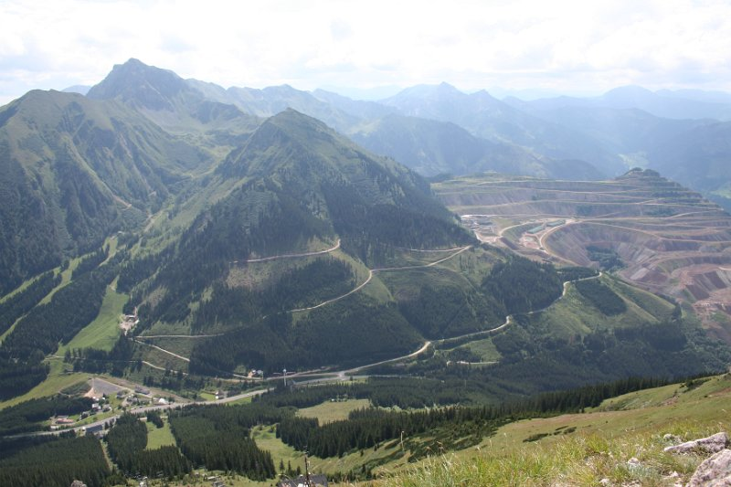 | 4. August 2010 Präbichl – SattelPasshöhe: 1226 m Auf der Erlauftal – Bundesstraße (25) die letzten Kilometer bis Lainbach, dann auf der Eisenstraße (115) bei mäßigem Anstieg nach Hieflau und Eisenerz. Derzeit weist der Fahrbahnbelag zahlreiche Risse, Längs- und Querrillen und materialmordende Löcher auf – Vorsicht beim Bergabfahren! Teilweise ist ein Radweg vorhanden, der allerdings sehr häufig die Straße 115 quert; sein Fahrstreifen ist stellenweise arg verschmutzt, seitliches Gebüsch ragt stellenweise bis zur Mitte. Achtung bei den Bushaltestellen auf hohe Granitsteinkanten. Der bachseitige Anbau ist architektonisch gut gelungen, der Fahrbelag ist jedoch aus querliegenden Holzbalken gebildet und selbst Hobby-Fahrern nicht zumutbar (was sich die Erbauer dabei gedacht haben könnten, bleibt dem Verfasser dieser Zeilen auch nach längerem Nachdenken verborgen). Vor Erzberg ist ein kurzer Abstecher zum Leopoldsteiner See unbedingt zu empfehlen – ein herrliches Panorama lohnt die kurze Zufahrt. Die Seepromenade ist nicht asphaltiert, sodass eine Umrundung mit dem Rad nicht zu empfehlen ist. Ab der kleinen Stadt Eisenerz (736 m) ein bis etwa 10% steiler Anstieg – bei mäßigem Verkehrsaufkommen (wochentags) und herrlichen Ausblicken auf den Erzberg eine angenehme etwa 10 km lange Auffahrt zur Passhöhe (1226m). Von hier bieten sich einige Wanderungen in den westlichen Ausläufer des Hochschwabs an, aber das ist eine andere Geschichte. WikiPedia:Präbichl (abg. am 13. Juli 2025) |