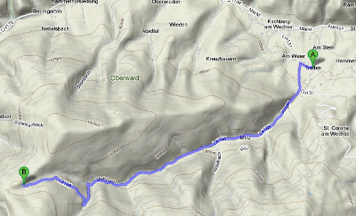 | 28. August 2012 Kirchberg / Wechsel – Steyersberger SchwaigRoute: Von Kirchberg am Wechsel, Tratten (580 m), über die LH137 und L4186 entlang des Molzbaches zur Steyersberger Schwaig (1371 m).