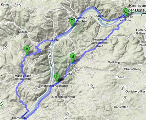 | 3. September 2012 Wachau – Maria Langegg und JauerlingRoute: Aggsbach Dorf (210 m) – Maria Langegg – Nesselstauden Geyersberg (540 m) – Oberbergern – Mautern – Stein – Dürnstein – Wösendorf in der Wachau – Spitz – Oberndorf am Jauerling (830 m) – Schallemmersdorf – Melk – Aggsbach Dorf (ca 70 km).