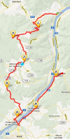 | 14. Juli 2013 JauerlingRoute: Aggsbach – Spitz – Gut am Steg – Jauerling (Gipfel) – Schallemmersdorf – Melk (Donaubrücke) – Aggsbach (ca 47 km). Höhenprofil: