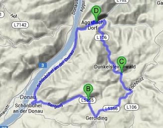 Die Straße nach Kochholz ist zwar (wie die Straßen im ganzen Verlauf) in gutem Zustand und vom Split gereinigt, allerdings sind immer wieder Steine auf der Straße, die dem Rennradfahrer zum Verhängnis werden – also Vorsicht auf der relativ steilen Abfahrt! Von Kochholz entlang des Wolfsteinbaches auf der sanft geneigten Straße an der Kartause Aggsbach vorbei und nach Hause ... Lohnend!