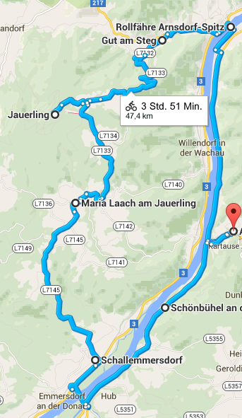 | 6. Juni 2015 JauerlingRoute: Aggsbach Dorf – Rollfähre Arnsdorf/Spitz – Gut am Steg – Jauerling – Emmersdorf – Schönbühel – Aggsbach Dorf (ca. 47 km).