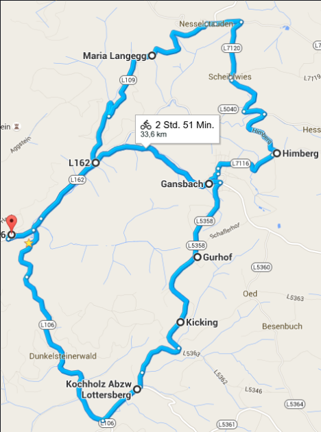 | 12. September 2015 Spätsommerliche WaldbrezeNein, das ist keine Umschreibung für einen Radsturz im Dunkelsteinerwald! Die Route von Aggsbach Dorf nach Maria Langegg – Scheiblwies – Gansbach – Aggsbach Dorf – Wolfstein – Kochholz – Kicking – Gurhof – Gansbach – Aggsbach Dorf gleicht einer Breze, daher der Name … (ca 34 km). Nicht nur die schönen Aussichten (bei spätsommerlichem Schönwetter) sondern auch das Höhenprofil ist nett!