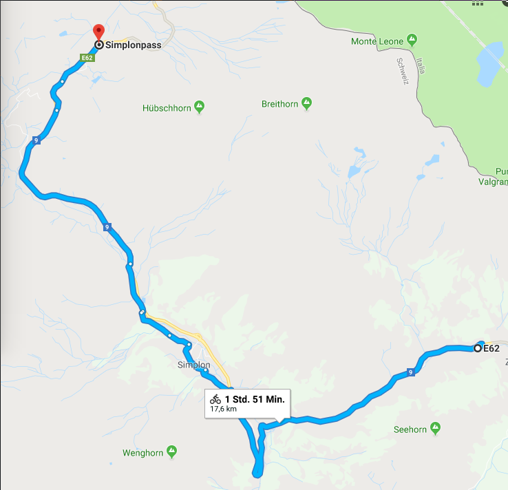 Route: Von Zwischenbergen/Gondo zur Passhöhe (17.6 km, 1018 Höhenmeter).