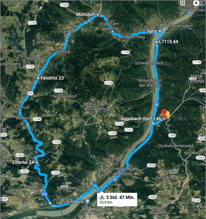 | 9. September 2018 Im südlichen Waldviertel (hinterm Jauerling ;-)Route: Aggsbach Dorf – Arnsdorf (Rollfähre) Spitz – Mühldorf – Zeining – Am Schuss – Weitenegg – Melk – Aggsbach Dorf (ca 54 km, 504 m up & down).