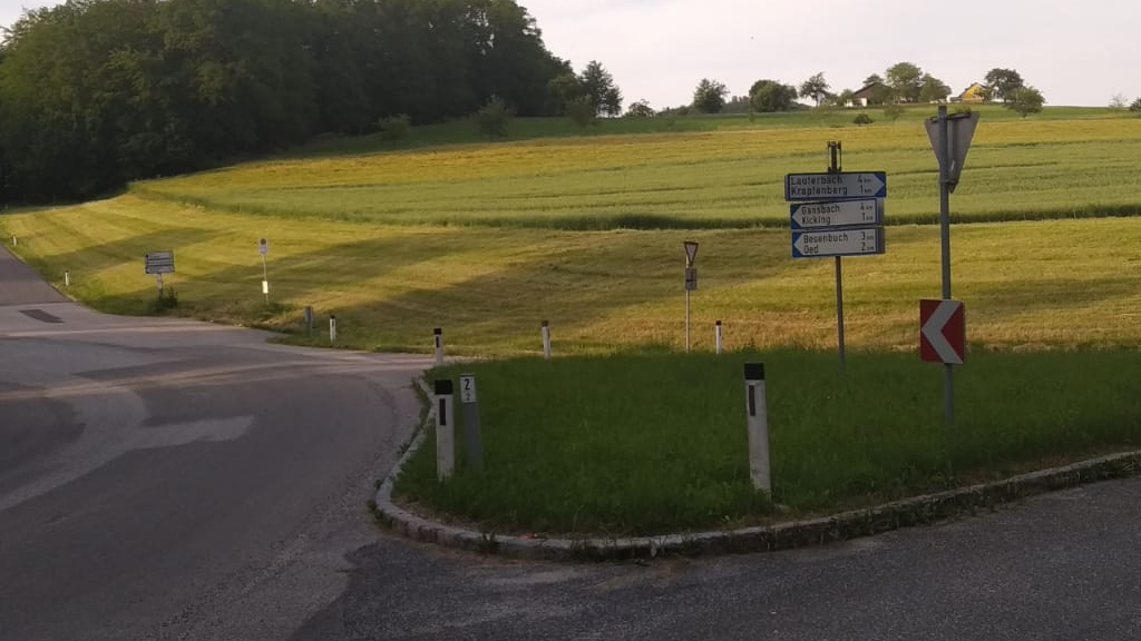 | 12. Juni 2019 LauterbachrundeRoute: Kochholz - Lauterbach - Weyersdorf  Fährt man von Kochholz („Abzweigung Lottersberg“) nach links in Richtung Gansbach, kommt man nach etwa 2 km zu den obigen Abzweigungen: Rechts geht es nach Lauterbach (4 km), „gerade aus“ nach Oed (2 km, gleich ziemlich steil, aber dann gemütlich nach Gansbach), und nach der Linkskurve nach Kicking (1 km, auch steil und dann nach Gansbach). Eigentlich geht es überall noch bergauf...