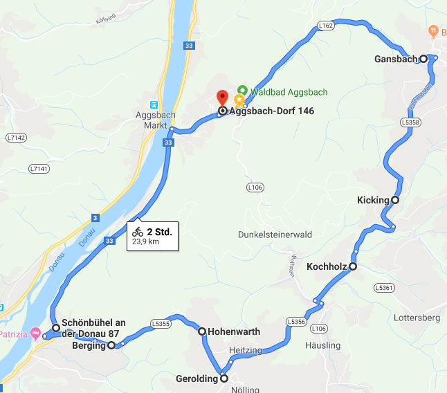 | 22. Juli 2019 Berging – Hohenwarth – Kochholz – GansbachRoute: Aggsbach Dorf – Schönbühel – Berging – (17 %) – Hohenwarth – Gerolding – Kochholz – Kicking – Gansbach – Aggsbach Dorf (ca 24 km, 480 m up&down).