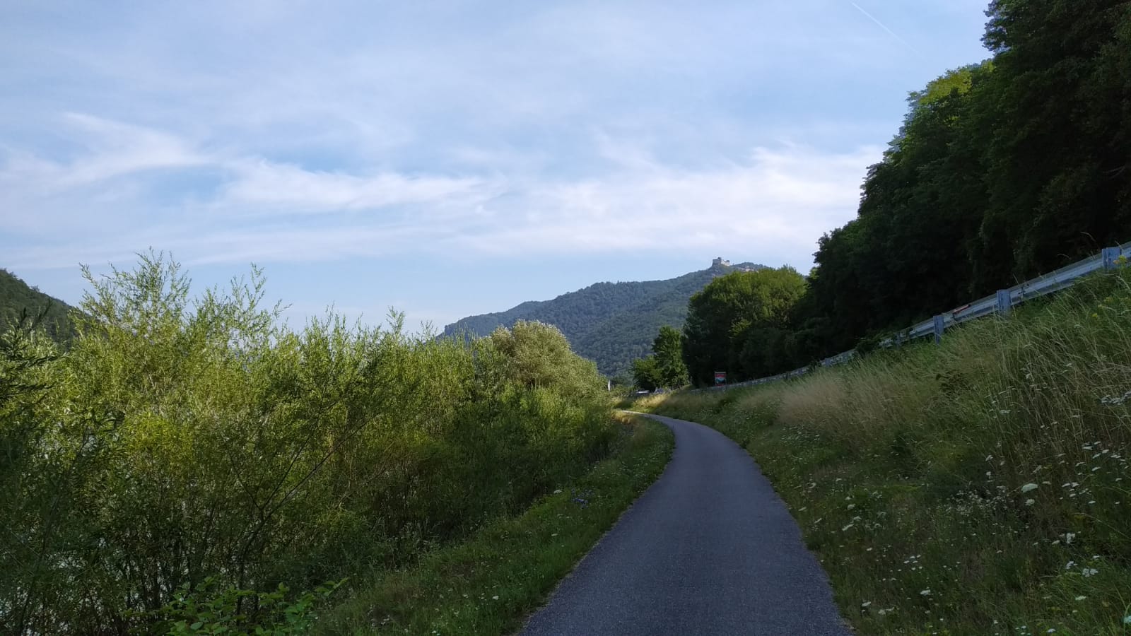 | 17. Juli 2019 JauerlingRoute: Am Donauradweg zur Rollfähre Arnsdorf – Spitz; über Gut am Steg nach Oberndorf und zur Jauerling-Aussichtswarte (ca 20 km, 760 m up). Nett.  Am rechten Donauufer, kurz nach Aggsbach Dorf mit Blick zur Ruine Aggstein.