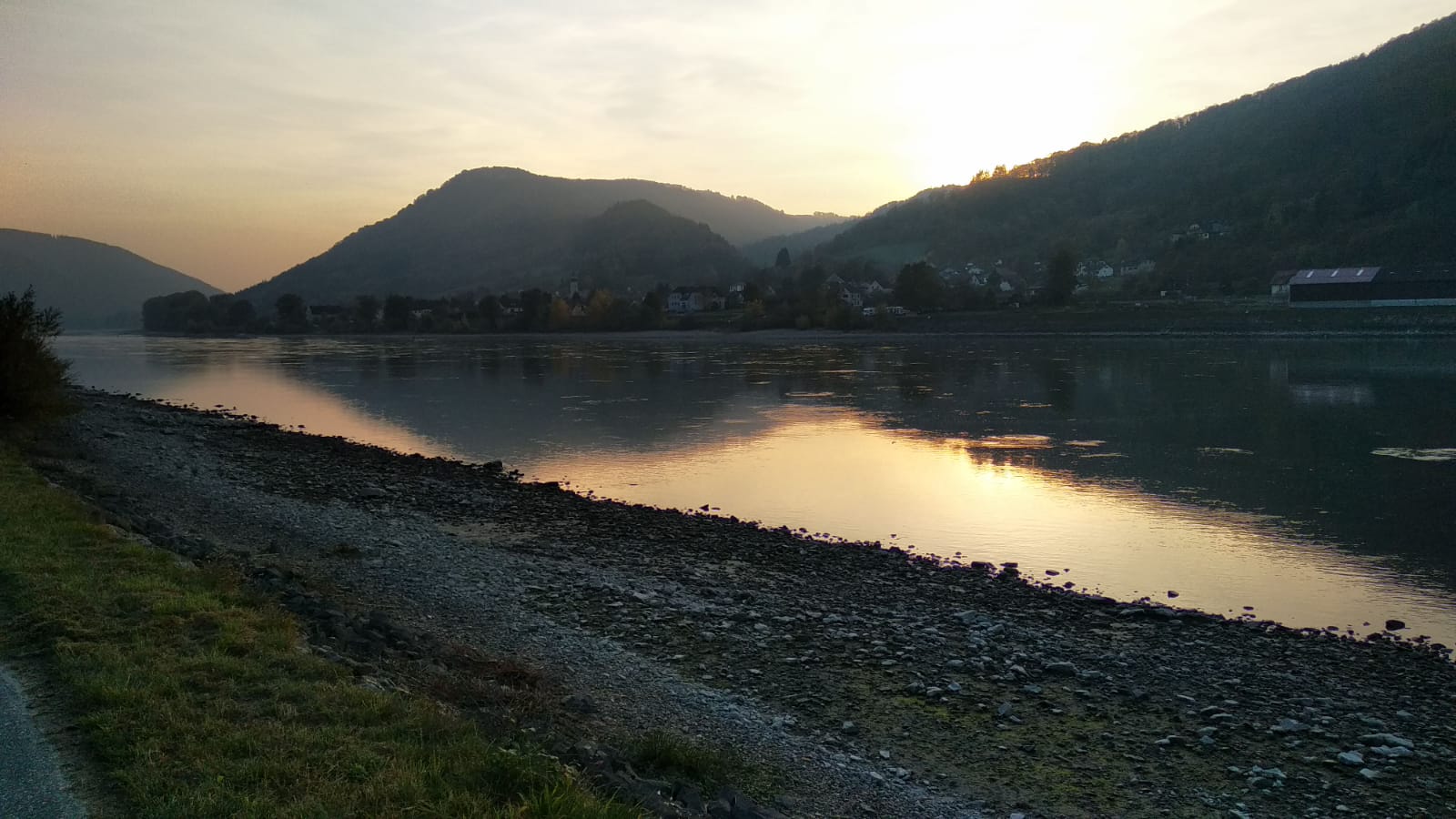 Bei wunderschönem Herbstwetter ist der Donauradweg wochentags nahezu leer von Radfahrerinnen und Radfahrern: Niedrigwasser.