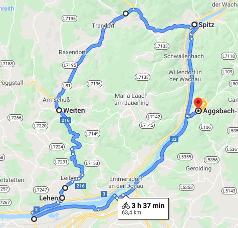 | 10. August 2020 Donauradweg – Lehen – Weiten – Mühldorf – SpitzRoute: Aggsbach Dorf – Melk – Donaubrücke bei Kleinpöchlarn – Lehen – Leiben – Weiten – Am Schuss – Mühldorf – Spitz – Aggsbach Dorf (ca 63 km, 440 m up & down).