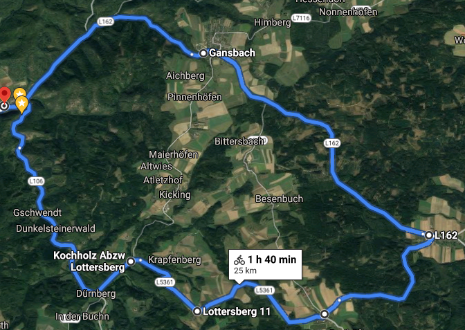 | 7. August 2021 Lottersberg – LauterbachRoute: Aggsbach Dorf – Wolfstein – Kochholz – Lottersberg – Lauterbach – Weyersdorf – Gansbach – Aggsbach Dorf (ca. 25 km, 439 m up&down).  20 Prozent Steigung nach der Abzweigung von Kochholz nach Lottersberg, noch eine Kehre – dann gemütlich durch den Wald (insbesondere von Lauterbach nach Weyersdorf).   Vor Lauterbach zweigt der Weg zum Dunkelstein ab. |