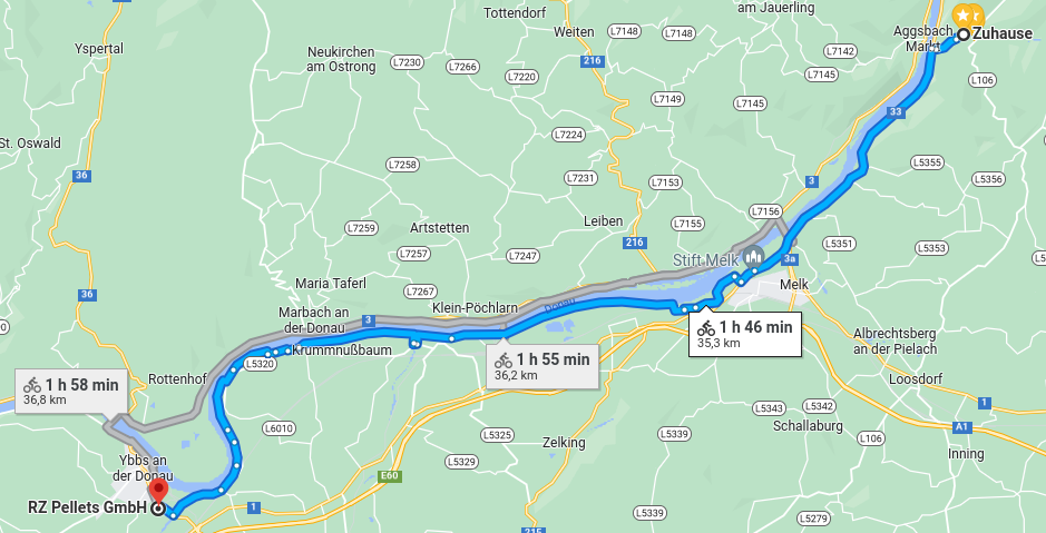 | 23. März 2022 Entlang der Donau nach YbbsRoute: Aggsbach Dorf – Melk – Pöchlarn – Ybbs (und zurück; ca 70 km, 120 m up&down).  Zwischen Krumnußbaum und Säusenstein ist der Radweg in einem erbärmlichen Zustand (Längsrisse im Belag, Bodenwellen – Sturzgefahr!).