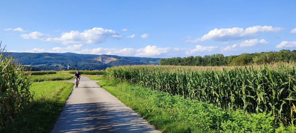 Eine angenehme, nette Runde über den Donauradweg, entlang der Pielach und schließlich durch den Dunkelsteinerwald und entlang des Wolfsteinbaches zurück (ca 27 km, Route, August 2021).