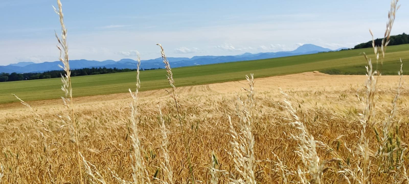 Weitblick über das sommerliche Wintergetreide zum Ötscher