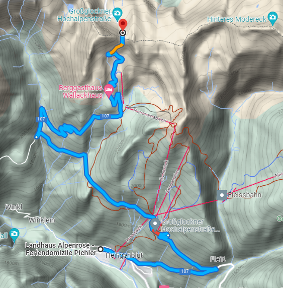| 21. August 2023 Auf der Großglockner Hochalpenstraße von Heiligenblut zum HochtorRoute: Winkl – Heiligenblut – Hochtor (16.3 km, 1400 m up & 157 m down). Von Winkl (Landhaus Alpenrose) nach Heiligenblut und dann über die B 107 zur Mautstelle. Radfahrer melden sich seitlich (der Bodenmarkierung folgend) mit einem Knopdruck an und werden – derzeit – ohne Kosten durchgelassen. Beim Kreisverkehr erste Ausfahrt (Passhöhe Hochtor, Salzburg) nehmen.