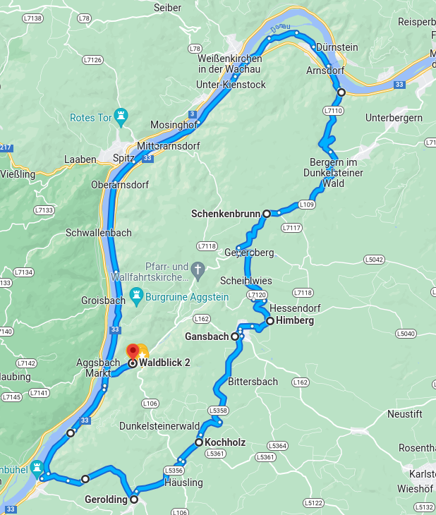 | 16. September 2023 Rechtes Donauufer - DunkelsteinerwaldRoute: Aggsbach Dorf – Schönbühel – Berging – Hohenwarth – Gerolding – Kochholz – Kicking – Gansbach – Himberg – Scheiblwies – Geyersberg Nesselstauden – Schenkenbrunn – Windstallgraben – Rossatzbach … Aggsbach Dorf (ca 55 km, 800m up&down).