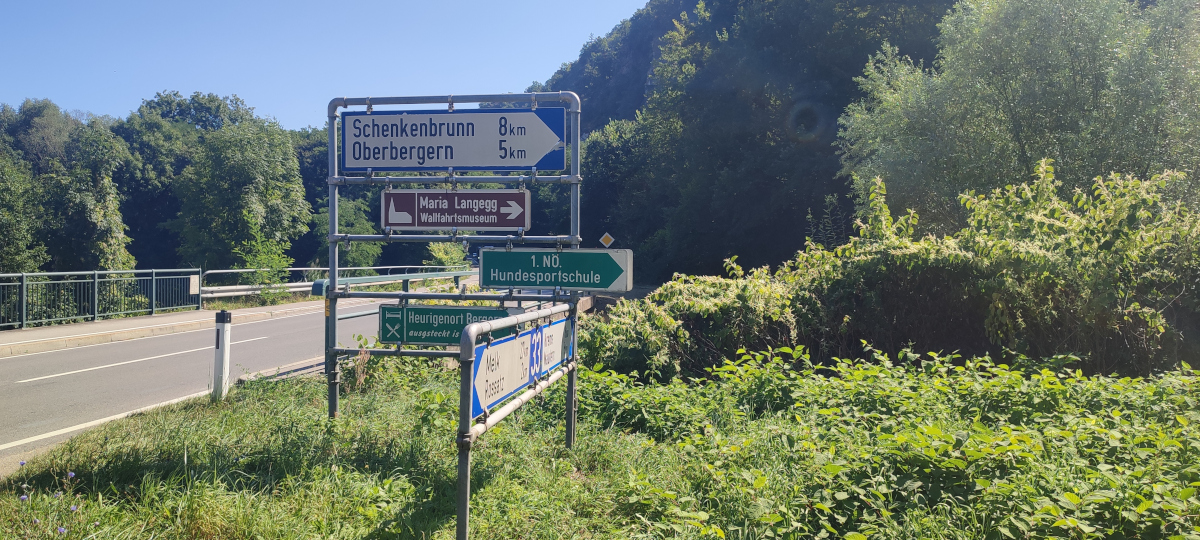 Anmerkung: Der Radweg wird wegen einer Baustelle in Rossatzbach auf einen Schotterweg geführt, mit dem Hinweis „Schiebestrecke“. Da dies für Radfahrende unzumutbar ist, empfiehlt es sich hier zur B33 zu fahren (von Melk kommend nach rechts abzweigen, nach einigen Häusern links auf die B33 abbiegen), und bei der Abzweigung nach Maria Langegg wieder auf den Radweg zu fahren, der auf der linken Straßenseite von der Donau herauf kommt. Es ist schwer einzusehen, warum nicht gleich eine Umleitung für den Donauradweg über die B33 eingerichtet wurde (vgl. Baustalle in Mitterarnsdorf – Bacharnsdorf). |