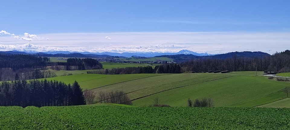 Auf der Straße nach Mauer, nach Häusling: Blick zu den frisch winterlichen Berggipfeln im Süden von Niederösterreich.