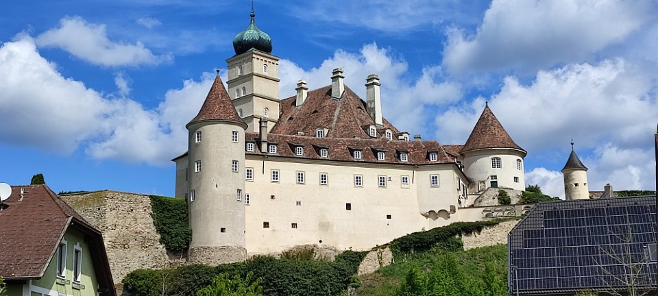 Beste Sicht auf das Schloss – von der Ortsdurchfahrt in Schönbühel.