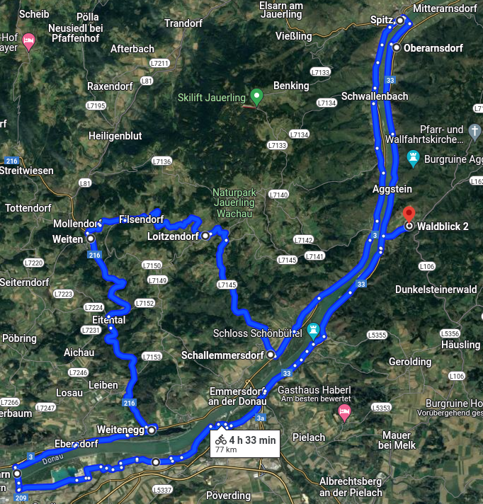 | 2. Mai 2024 Weitental - Loitzendorf - SpitzRoute: Aggsbach Dorf – Pöchlarn/Donaubrücke – Weitenegg – Filsendorf – Loitzendorf – Schallemmersdorf – Spitz/Donaufähre – Aggsbach Dorf (77 km, 580 m up&down).