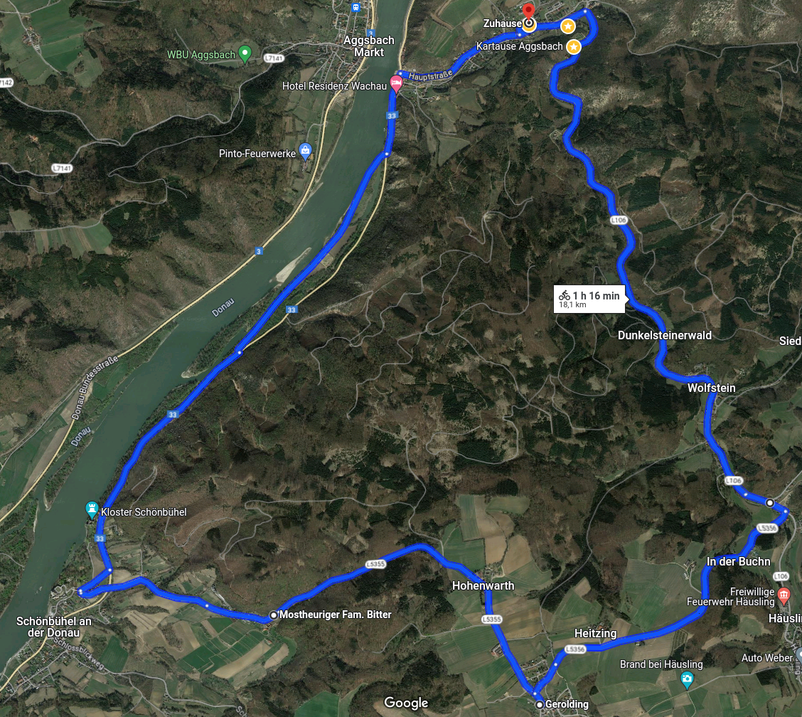 Nach dem kurzen Anstieg von Schöbühel nach Bering (bis 16 % Steigung) und dem längeren Anstieg von Berging nach Hohenwarth eine schöne Abfahrt nach Kochholz und Aggsbach Dorf. |
