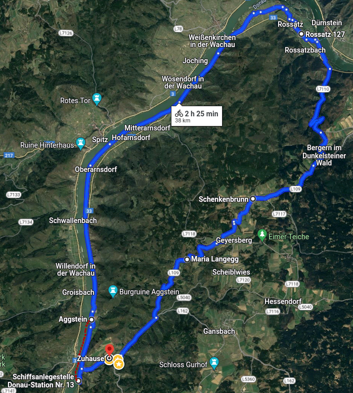 | 23. Juli 2027 Donauradweg – Windstallgraben – Maria LangeggRoute: Aggsbach Dorf – Schiffsanlegestelle Nr. 13 – Aggstein (Fähre) – Rossatzbach – Windstallgraben – Schenkenbrunn – Maria Langegg – Aggsbach Dorf (ca 38 km, 440 m up&down).  Mit der Fähre von der Schiffsanlegestelle in Aggsbach Dorf am Felssturz vorbei nach Aggstein.