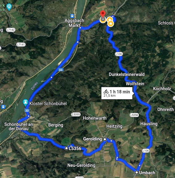 | 27. August 2024 GeroldingRoute: Aggsbach Dorf – Schönbühel – Gerolding – Umbach – Aggsbach Dorf (ca 21 km, 270 m up&down).  Beim Schloss Schönbühel vorbei, nach der Kreuzung mit der B33 nach links (Richtung Gerolding) abbiegen. Ein großteils gemütlicher Anstieg bis Gerolding, über den Kirchenberg nach Nölling, Lerchfeld, Umbach und entlang des Wolfsteinbaches nach Hause zurück.