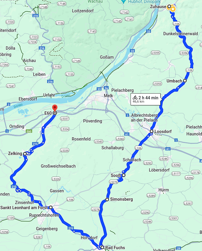 | 16. August 2024 Mank - Ende im GewitterregenRoute: Aggsbach Dorf – Umbach – Loosdorf – Sooß – Simonsberg – Mank – St. Leonhard – Zelking – Matzleinsdorf/Autobahnbrücke A1 (ca 47 km, 420 m up&down). Die Fahrt von Sooß über Simonsberg nach Mank bietet eine kurze, nette Auffahrt durch den Wald an.