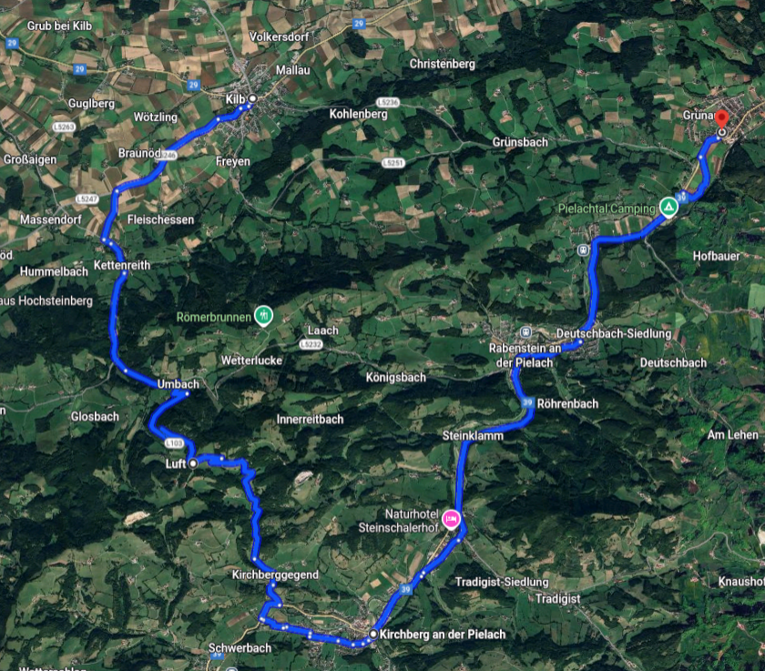 Von Kilb über die L5246 nach Kettenreith und Umbach, dann auf der L103 ins Pielachtal und auf der B39 von Kirchberg nach Hofstetten-Grünau. Die Anstiege sind insgesamt sanft; teilweise bieten sich schöne Ausblicke...